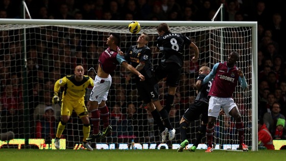 Brendan Rodgers mandou a campo o que tinha. Por mais que eu prefira ficar com um a menos do que com Downing em campo, o jogador até que comprometeu pouco ontem. Além disso o técnico sabia que o jogador poderia ser sua salvação para a lateral esquerda, já que Enrique não estava 100% fisicamente. E não deu outra. Aos 26 minutos Enrique teve que sair, Joe Cole entrou no meio e Downing foi para a lateral esquerda. Do outro lado, os Hammers apostavam principalmente nas jogadas aéreas, muito por causa de terem Carlton Cole dentro da área. E o centro avante deu muito trabalho para a defesa vermelha em todo o jogo. Mas os 15 primeiros minutos foram de superioridade dos visitantes. E essa superioridade foi convertida em vantagem no placar quando aos 11 minutos Johnson recebeu belo passe de Gerrard, carregou da ponta pro meio e soltou um petardo no ângulo direito de Jaaskelainen sem chances para o goleiro. Nosso lateral não comemorou, porque foi formado na base dos Hammers. E outros jogadores que passaram pelo clube ainda nos ajudariam no jogo...